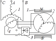 В качестве источника постоянного напряжения может использоваться питаемый от трехфазной сети выпрямитель. В настоящее время эксплуатируются также синхронные машины с так называемым «бесщеточным» возбуждением. В качестве возбудителя используется маломощный синхронный генератор: поток возбуждения создается неподвижными постоянными магнитами 1 (рис. 3.43), трехфазная обмотка 2 возбудителя расположена на роторе. При вращении вала машины во вращающейся вместе с ним обмотке 2 генерируется трехфазная ЭДС, которая подводится к смонтированному непосредственно на валу выпрямителю 3, питающему обмотку возбуждения 4 основной синхронной машины. Отсутствие скользящего контакта щетки – кольца повышает надежность системы возбуждения. Мощность системы возбуждения составляет 1–3% от мощности якоря.