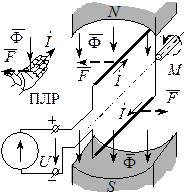 Рассмотрим принцип действия ДПТ. От источника постоянного напряжения U в рамку подается ток I. По правилу левой руки (ПЛР) на активные проводники (утолщенные линии) действует пара сил F, создающая вращающий электромагнитный момент M. Рамка поворачивается против часовой стрелки, но угол поворота не более 90°. Для обеспечения непрерывного вращения нужно взять несколько рамок с общей осью, равномерно смещенных по направлению вращения.