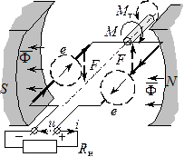 При вращении рамки активные проводники пересекают силовые линии потока Ф и в них по закону электромагнитной индукции наводятся ЭДС, направления которых определяются по правилу правой руки (ППР). Эти ЭДС направлены против тока I и называются противо-ЭДС. Здесь работает и правило Ленца: ЭДС действуют против причины, их вызвавшей, т. е. против тока I. Поскольку е – переменная ЭДС, то и ток будет переменным.