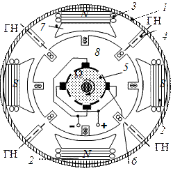 По отношению к внешним зажимам обмотка якоря оказывается разделенной на четыре параллельные ветви (на рис. а изображена только одна ветвь). Они эквивалентны одной ветви на рис. б. Плоскость, проходящая посредине между соседними полюсами через ось якоря, образует геометрическую нейтраль ГН (на рис. их две). Щетки располагают так, чтобы в момент закорачивания ими соседних ламелей секция, подключенная к этим ламелям, проходила через ГН. Это устраняет искрение в режиме холостого хода ГПТ.