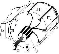 Петлевая обмотка состоит из отдельных секций. Активные проводники двух сторон секции (П1 и П2) помещают в разные пазы якоря так, чтобы они оказались под разноименными полюсами (на расстоянии полюсного деления τ, где τ – длина дуги окружности якоря между осями соседних полюсов). При этом ЭДС, наводимые в двух сторонах секции, будут суммироваться. Начало и конец секции припаивают к соседним ламелям коллектора. Начало стороны следующей секции объединяется с концом предыдущей (на рис. показаны только две секции). Тогда якорная обмотка оказывается замкнутым контуром. Каждая секция состоит из нескольких витков (на рис. секции условно показаны одновитковыми).