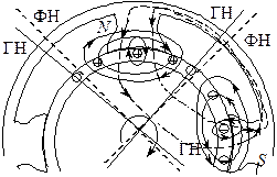 На рисунке показано поле генератора, якорь которого вращается по часовой стрелке. Тогда токи в проводниках под верхним N -полюсом направлены от нас, а у правого S -полюса – к нам. В результате поток в зазоре под набегающим краем наконечника (левым) ослабляется Ф – ∆Ф, а под сбегающим (правым) – усиливается Ф + ∆Ф. У двигателя – наоборот. Номинальный режим должен быть на середине колена кривой на рисунке, где F = Iw – МДС. Из-за насыщения +∆Ф гораздо меньше –∆Ф, что уменьшает и искажает результирующий поток Ф. Физическая нейтраль (ФН) у генератора получается повернутой на некоторый угол по направлению вращения, у двигателя – против. Уменьшение потока приводит у ГПТ к падению E, у ДПТ – к падению М и изменению Ω.