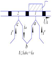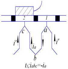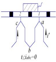 В момент t 1 щетка находится на коллекторной пластине 1, ток во внешнюю цепь течет через точку «а» из секций, расположенных как справа от коммутирующей секции «abc»,так и слева от нее, вследствие чего ток по коммутирующей секции течет от точки «с» к точке «а».