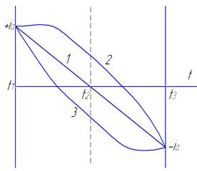 Так как перемещение щетки по коллектору заведомо равномерное, отрезки времени t 1 – t 2 и t 2 – t 3 равны. Рассматривая изменение тока в секции «авс» только как функцию перемещения щетки, можно сделать вывод, что ток линейно зависит от времени, как показано линией 1. Такая коммутация называется прямолинейной и представляет собой идеализированный случай. Фактически процесс коммутации протекает сложнее, так как изменение тока в коммутирующей секции зависит не только от перемещения щетки, но и от ЭДС, индуктируемых в этой секции. Это прежде всего ЭДС самоиндукции