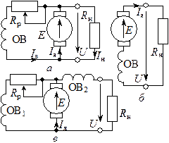 Схемы ГПТ с параллельным (а), последовательным (б) и со смешанным (в) возбуждением |