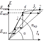 Процесс самовозбуждения можно проиллюстрировать, добавив к характеристике холостого хода прямую 2, построенную по уравнению E = (R я + R р + R в) I в»(R р + R в) I в. Ее угол наклона можно регулировать изменением сопротивления R ррегулировочного реостата. При пуске R р выведено, т. е. R р = 0. Тогда прямая 2 имеет минимальный угол наклона, определяемый сопротивлением R в обмотки возбуждения. Процесс самовозбуждения показан стрелками: вначале из точки Е ост – горизонтальный ход до прямой 2, далее вертикальный ход до характеристики 1, затем опять горизонтальный ход до прямой 2 и т. д. Процесс оканчивается в точке пересечения кривой 1 и прямой 2 при Е = Е mах. Это устойчивое возбуждение. Для снижения Е mах до Е ном вводят реостат R р. При этом угол a увеличивается и прямая 2 занимает положение 3. Увеличение R р, при котором прямая 3 занимает положение 4, сделает работу генератора неустойчивой и Е может упасть до Е ост. Сопротивление цепи возбуждения R р.кр + R в, определяющее угол aкр, называют критическим. Самовозбуждение при таком и большем сопротивлении невозможно.