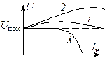 (потоки Ф1 и Ф2 сонаправлены и Фв = Ф1 + Ф2) или встречно (Ф1 и Ф2 встречны и Фв = Ф1 – Ф2). Характеристика холостого хода генератора совпадает с характеристикой на рис. 3.66 (обмотка ОВ2 не задействована). При согласном включении обмоток число витков ОВ2 можно подобрать так, что даваемое ОВ2 подмагничивание будет компенсировать падение напряжения. В этом случае внешняя характеристика идет почти горизонтально (1 на рис.). При увеличении витков ОВ2 получим характеристику 2. Это позволяет компенсировать потерю напряжения не только внутри генератора, но и в передающей линии. При встречном включении обмотка ОВ2 размагничивает генератор тем сильнее, чем больше ток нагрузки. Поэтому внешняя характеристика имеет крутопадающий участок (кривая 3 на рис.). Такие генераторы используют в сварочных установках, для питания печей, прожекторов. Среди ГПТ генераторы смешанного возбуждения получили наибольшее распространение.