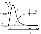В момент пуска якорь двигателя неподвижен (n = 0), поэтому отсутствует противоЭДС (E = C eФ n = 0). Из уравнения якорной цепи видно, что пусковой ток якоря I я.п = U ном/ R я ограничен только сопротивлением обмотки якоря R я. Поскольку R я мало (особенно у ДПТ средней и большой мощности), то пусковой ток велик и превышает номинальное значение в десятки раз (рис.). Время пуска t п длится десятые доли секунды у маломощных двигателей (менее 1 кВт) и достигает нескольких десятков секунд у мощных.