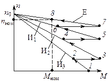 Сопротивление реостата R п рассчитывают так, чтобы для машин средней и большой мощности обеспечить I п = (1,4¸1,8) I ном, а для машин малой I п = (2¸2,5) I ном. Обычно по мере разгона двигателя сопротивление R п ступенчато выводят до нуля. Иллюстрация пуска для ДПТ параллельного возбуждения приведена на рис. Введение в цепь якоря сопротивления R п приводит к уменьшению «жесткости» механической характеристики тем сильнее, чем больше R п. Получаемые при этом характеристики называют искусственными. На рис. искусственной характеристике И3 соответствует R п с введенными тремя ступенями. Поочередный вывод ступеней R п дает «веер» характеристик И3, И2, И1, Е, где Е – естественная характеристика. Частота холостого хода п 0 при этом сохраняется. Процесс пуска характеризуется зигзагообразным движением точки вдоль стрелок из точки 1 к точке 8.