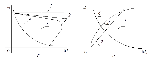 Механические же характеристики ЭД (рис.а) 1, 2, и 3 рассматривались в разделе «Электрические машины», а зависимость 4 представляет собой специальную механическую характеристику. Степень изменения скорости вращения с изменением нагрузки М у представленных ЭД различна и характеризуется их крутизной Sx или жесткостью β. Эти параметры механических характеристик имеют обратную зависимость β = –S– 1 х и позволяют классифицировать все ЭД по жесткости или крутизне характеристик на четыре вида: 1)абсолютно жесткие (β = ∞ – СД и специальные электромеханизмы); 2) жесткие (∞ > β > 3,5 – АД с к. з. ротором, ДПТ с независимым и параллельным возбуждением); 3) мягкой (–3,5 > β >1 – ДПТ последовательного возбуждения); 4) крутой характеристикой (ДПТ независимого возбуждения при I я= const и электромеханизмы со специальными устройствами управления).