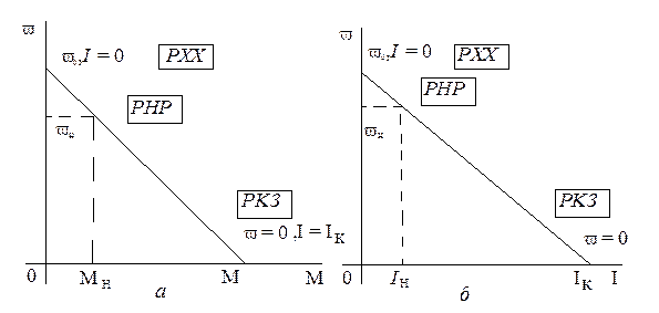 Изобразим выражения (1) и (2) графически. Зависимости ω(I) (рис. а) и ω(М) (рис. б) при ω0 = const, СЕ = const и R = const есть прямые линии в отрезках. При этом привод имеет два крайних режима работы:ω = ω0, I = 0, M = 0 – режим холостого хода (РХХ) и ω = 0, I = IK, M = MK – режим короткого замыкания (РКЗ).