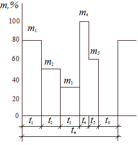 Исходными данными являются график относительной нагрузки (рис.) m (t)),где m = [(М / М mах)100](%); М mах – величина максимальной нагрузки, Н∙м; t ц и t 0 – время цикла работы и паузы ЭП, с; п – частота его вращения, мин–1.