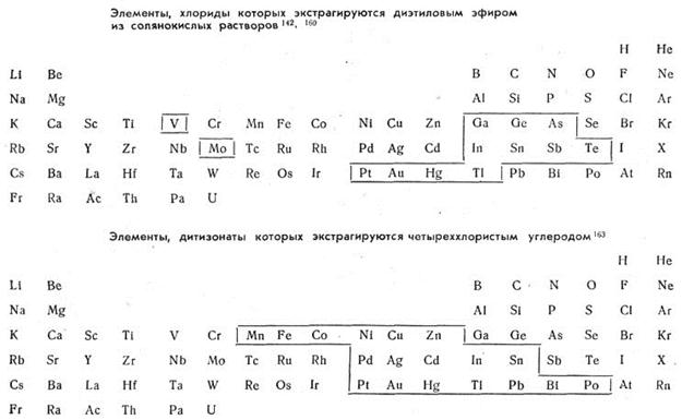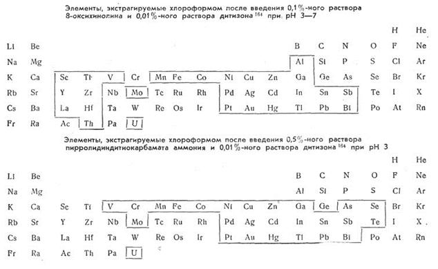 При некоторых условиях нередко экстрагируется целая группа ионов. Например, экстрагирование хлороформом при рН 3, затем при рН 5 и рН 7 после добавления растворов 8-оксихинолина и дитизона позволяет определять примесь 30 элементов в селене. Эти же примеси удается выделить и определить при анализе щелочных и щелочноземельных металлов и их солей.