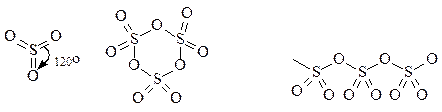 В газовой фазе и в разбавленных неводных растворах триоксид серы находится в мономерной форме. При конденсации паров SO3 образуется летучая бесцветная жидкость (tк=44,8оС), состоящая преимущественно из циклических тримерных молекул (SO3)3. При охлаждении до 16,8оС она затвердевает с образованием прозрачных кристаллов. Эта форма SO3 неустойчива и при хранении превращается в устойчивые, похожие на асбест нити. Полимеризацию SO3 предотвращают введением Р2О5 и других ингибиторов.