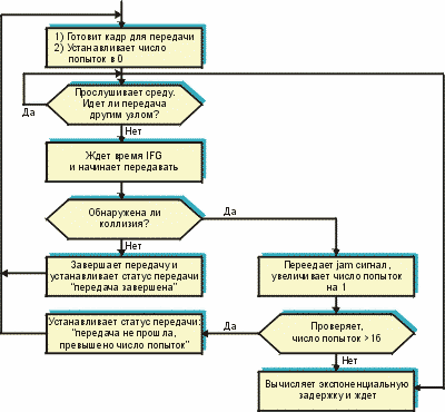 4. После передачи jam-сигнала станция замолкает и ждет некоторое произвольное время в соответствии с правилом бинарной экспоненциальной задержки и затем возвращается к шагу 1.