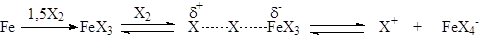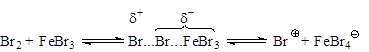 При хлорировании аренов в этих условиях электрофильной частицей является хлорид-катион. При бромировании в случае использования FeBr3 и других мало активных кислот Льюиса, основной атакующей частицей является поляризованный комплекс, например: