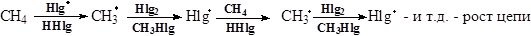 - Механизм процесса. Галогенирование алканов и в боковую цепь аренов является радикальным цепным процессом (SR), который инициируется как термически, так и облучением светом: