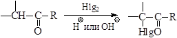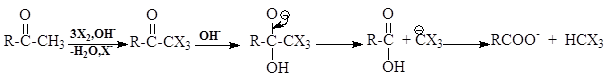 Моногалогенирование можно провести лишь в присутствии кислоты. В присутствии оснований идет полигалогенирование. Если с карбонильной группой связан метильный радикал, имеет место галоформная реакция– это реакция галогенирования метилкарбонильных соединений в щелочной среде, в результате чего образуется галоформ.