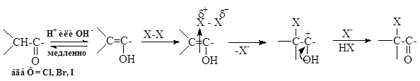 Гетеролитическое галогенирование альдегидов и кетонов (кроме фторирования) в присутствии кислот и оснований идет в a-положение по отношению к карбонильной группе: