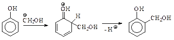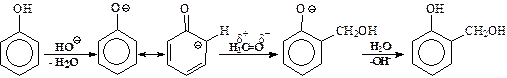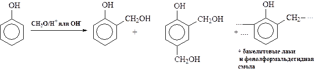 - Фенол реагирует с формальдегидом в присутствии разбавленных кислот или щелочей. Из самого фенола при этом образуется смесь салицилового спирта и 4-гидроксиметилфенола. При избытке формальдегида образуются ди- и тригидроксиметилфенолы. Образовавшиеся гидроксиметилфенолы могут реагировать с фенолом и между собой образуя димеры и полимеры – бакелитовые лаки и фенолформальдегидную смолу.