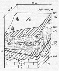 1 — слой суглинка; 2 — слой песка, включающий линзу гравия 3; 4 — слой супеси, вклю-чащий песчаный прослой 5,6 — известняк; С, fQ, aQ, dQ — геологические индексы возраста и генезиса
