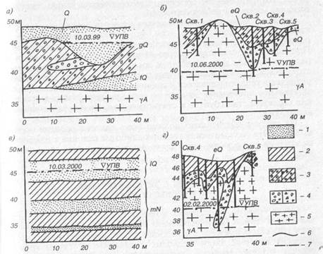 а — ледниковые и водно-ледниковые отложения; 6 — элювий; в — морские и озерные отложения; г — элювий (детализация); 1 — песок; 2 — суглинок; 3 — то же, с включением крупнообломочного материала; 4 — крупнообломочные грунты; 5 — гранит выветрелый, трещиноватый; 6 – граница между геологическими телами; 7 — уровень подземных вод и дата его измерения; индексами обозначены возраст и происхождение горных пород: γА — граниты архейской эры; mN — морские отложения неогенового периода; IQ — озерные четвертичные отложения; eQ — элювиальные четвертичные образования; gQ — ледниковые четвертичные гажения; fQ — водно-ледниковые четвертичные отложения; aQ — речные четвертичные отложения