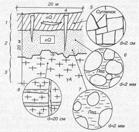 1 – слой суглинка; 2 – слой песка; 3 – трещиноватая скальная порода; 4 – жилы и линзы льда; 5 – сеть ледяных жилок в суглинке (сетчатая текстура); 6 – поровый лед-цемент заполняет поры между частицами (массивная текстура); 7 – базальный лед-цемент разобщает частицы (корковая текстура); 8 – трещинный лед в скальной породе (слоистая текстура, приближающаяся к ячеистой)