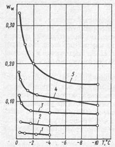 Рис. 6. Кривые содержания незамершей воды в мерзлых грунтах в зависимости от отрицательной температуры (по Н.А. Цытовичу)