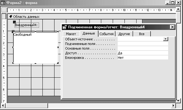 Внедрить подформу в главную форму можно с помощью соответствующего инструмента панели элементов. После размещения элемента управления Подчиненная форма в нужном месте главной формы появляется изображающий ее белый прямоугольник. Прямоугольник следует перетащить в нужное место главной формы и передвинуть его границы так, чтобы установить размер подформы.