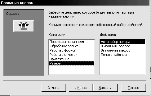 После размещения элемента управления Кнопка в форме открывается окно Мастера Создание кнопок. На первом шаге работы Мастера из списка выбирается действие, которое будет выполняться при нажатии кнопки. Список возможных действий сгруппирован по категориям. Поэтому вначале надо выбрать определенную категорию, а затем – конкретное действие. Далее по указаниям Мастера выбирается текст или рисунок, который будет помещен на кнопку, и устанавливается имя кнопки. После окончания работы Мастера созданную кнопку можно переместить в нужное место формы и определить ее размеры. В режиме Таблицы проверяется работа кнопки.