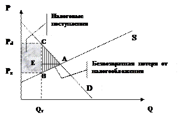 ством после налогообложения, показывает сумму, получаемую государством в виде налога (величину налоговых сборов).Подобно установлению фиксированных цен, введение налога уменьшает благогосостояние общества, т.е. общий излишек (сумму излишков потребителя и производителя, а также, в данном случае, налоговых поступлений государства) (см. рис. 3).