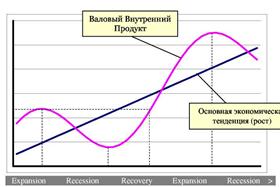 Цикл представляет собой интервал времени в развитии рыночной экономики, в течение которого происходит увеличение объема производства товаров и услуг, а затем сокращение, спад, депрессия, оживление и, наконец, снова его рост. Все эти циклические изменения происходят в русле глобальной тенденции, в данный момент времени главенствующей на рынке. То есть, если экономика растет, то она растет циклично, и каждое последующее повышение будет выше, чем предыдущее. Если экономика падает, то падает она тоже циклично, и каждый последующий минимум будет ниже предыдущего.
