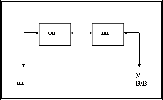 Любой современный компьютер имеет ОП – оперативную память, ЦП – центральный процессор, ВП – внешнюю память и У В/В – устройства ввода вывода.