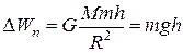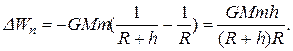 Изменение потенциальной энергии тела массы m, поднятого с поверхности Земли (r = R, где R – радиус Земли)на высоту h (r = R + h), согласно (16), равно:
