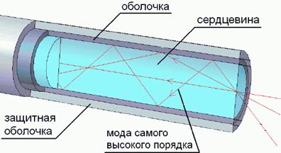 Принцип распространения оптического излучения вдоль оптического волокна (ОВ) основан на отражении от границы сред с разными показателями преломления (Рис. 4). Оптическое волокно изготавливается из кварцевого стекла в виде цилиндров с совмещенными осями и различными коэффициентами преломления. Внутренний цилиндр называется сердцевиной ОВ, а внешний слой - оболочкой ОВ.
