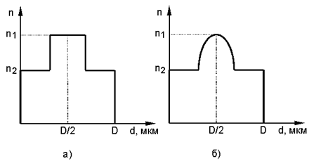 В зависимости от вида профиля показателя преломления сердцевины различают ступенчатые и градиентные ОВ. У ступенчатых ОВ показатель преломления сердцевины постоянен (Рис. 5, а). У градиентных ОВ показатель преломления сердцевины плавно меняется вдоль радиуса от максимального значения на оси до значения показателя преломления оболочки (Рис., 5 б).