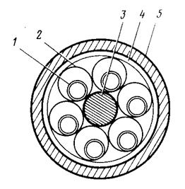 Рис. 7. Конструкция оптического кабеля: 1 - ОВ, 2 - полиэтиленовая трубка, 3 - силовой элемент, 4 и 5 - соответственно внутренняя и внешняя полиэтиленовые оболочки