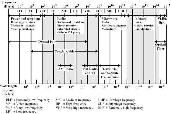 На рис. 5 изображен спектр электромагнитных волн и обозначены частоты, на которых функционируют различные направляемые среды, и указаны методы ненаправленной передачи.
