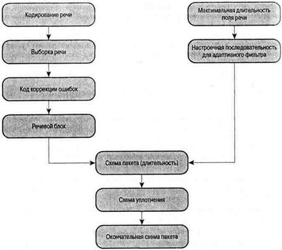 На рис. 2 приведены шаги, которые предлагается выполнить при проектировании слота системы TDMA. Кодер речи должен обеспечивать удовлетворительное качество речи при минимальной скорости передачи данных. Традиционным видом речевого кодирования, дающим поток цифровых битов, является импульсно-кодовая модуляция (РСМ), которая приводит к скорости передачи данных 64 Кбит/с. Эта скорость слишком высока для сотовой связи. Для имеющихся в настоящее время технологий разумно использовать скорость передачи данных около 12 Кбит/с, что дает хорошее качество воспроизведения речи.