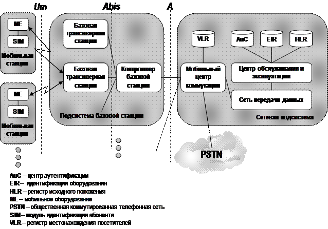 На рис. 4 показаны ключевые функциональные элементы системы GSM, Линии Um, Abis и А обозначают интерфейсы между функциональными элементами, которые стандартизированы в документации GSM. Таким образом, можно приобретать оборудование у разных поставщиков и ожидать, что оно будет успешно взаимодействовать. В стандарте GSM определены также дополнительные интерфейсы.