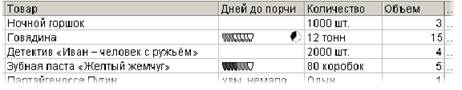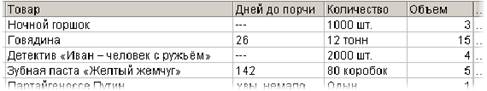 Рассмотрим пример: в гипотетической системе складского учета есть отчет, показывающий все товары на складе. Одним из вариантов вида этого отчета является банальный список. Попробуем сделать его лучше. Сначала нужно определить, зачем этот отчет нужен, и какие поля должны быть в списке. Здесь очень многое зависит от ситуации, поэтому я не буду производить попытки таксономии складов, а просто скажу: предположим, что нам нужно облагородить столбцы Товар, Дней до порчи, Количество и Занимаемый объем. Поехали.