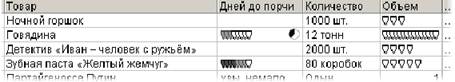 Итого, со столбцом «Дней до порчи» разобрались. Следующим идет столбец «Количество». Здесь другая проблема – единицы измерения у разных товаров различаются, что не позволяет визуализировать «сравнительность» параметров. Невозможно также визуализировать количество элементов, поскольку это количество может быть очень большим (визуализировать тысячу ночных горшков можно, но при этом будет затрачено чуть ли не всё пространство экрана, а главное, явной разницы между девятью сотнями и тысячей горшков видно не будет). Таким образом, остается лишь возможность визуализации единиц измерения, в данном случае штукам, тоннам и коробкам можно нарисовать пиктограммы. Весь вопрос в том, стоит это делать или нет. Большинство людей получает такое удовольствие от рисования пиктограмм, что сам вопрос необходимости этого рисования отходит на второй план. В то же время пиктограммы в такой роли имеют как достоинства, так и недостатки. Недостатки у пиктограмм следующие: