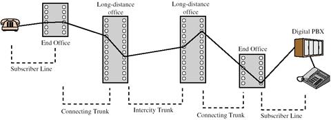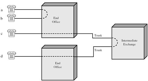 Абоненты соединяются непосредственно с конечной станцией, которая коммутирует телефонный обмен между абонентами и между абонентом и другими коммутаторами. Другие коммутаторы отвечают за маршрутизацию и коммутацию телефонного обмена между конечными станциями. Это различие показано на рис. 3. Соединение между двумя абонентами, подключенными к одной и той же конечной станции, создается таким же образом, как описано выше. Если абоненты подключены к разным конечным станциям, соединение между ними стоит из цепи соединений через одну или более промежуточных станций. На рисунке соединение между абонентами а и b создается путем их простой коммутации через конечную станцию. Установка соединения между c и d более сложна. На конечной станции абонента с устанавливается соединение между линией абонента с и одним каналом магистрали с временным уплотнением к промежуточному коммутатору. В промежуточном коммутаторе этот канал соединяется с каналом с временным уплотнением, ведущим к конечной станции абонента d. На этой конечной станции канал соединяется с линией абонента d.