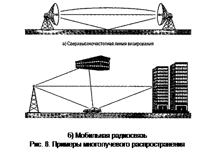 На рис. 8 схематически изображены основные виды многолучевого распространения, типичные для неподвижных сверхвысокочастотных устройств, а также для наземных и мобильных систем связи. В первом из упомянутых случаев кроме распространения вдоль линии прямой видимости сигнал может преломляться атмосферой. Могут также присутствовать сигнальные компоненты, вызванные отражением от земли. При мобильной связи отражающую поверхность представляют здания и другие объекты местности.
