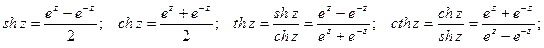 Определение. Гиперболическим синусом, косинусом, тангенсом и котангенсом называются соответственно функции: