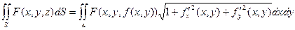 Проведя рассуждения, аналогичные тем, которые использовались при нахождении криволинейного интеграла, получим формулу для вычисления поверхностного интеграла первого рода через двойной интеграл по по площади проекции поверхности на плоскость XOY.