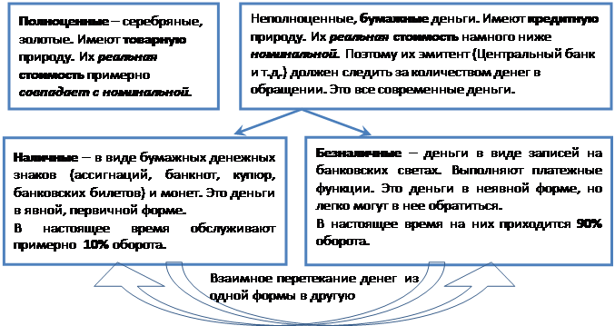 Ранее уже упоминалось о таких видах денег, как реальные полноценные (серебряные и золотые) деньги и бумажные деньги. Помимо этого можно привести другую их классификацию – деньги существуют в наличной и безналичной форме: