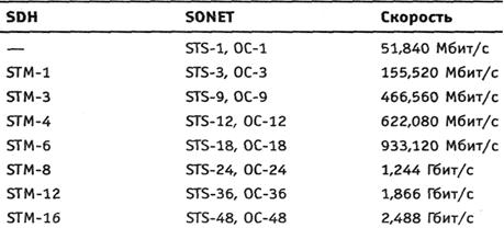 Иерархия скоростей при обмене данными между аппаратурой SONET/SDH, которую поддерживает технология SONET/SDH, представлена в табл. 2.