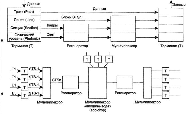 Как видно из рис. 4, регенераторы работают только с протоколами двух нижних уровней, отвечая за качество сигнала и поддержания операций тестирования и управления сетью. Мультиплексоры работают с протоколами трех нижних уровней, выполняя, кроме функций регенерации сигнала и реконфигурации секций, функцию мультиплексирования кадров STS-n разных уровней. Кросс-коннектор представляет собой пример мультиплексора, который поддерживает протоколы трех уровней. И, наконец, функции всех четырех уровней выполняют терминалы, а также мультиплексоры «ввода-вывода», то есть устройства, работающие с пользовательскими потоками данных.