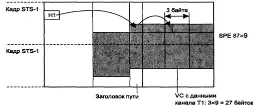 Тот же прием применяется для вставки или удаления пользовательских данных в потоке кадров STS-n. Пользовательские данные каналов типа Т1/Е1 или ТЗ/ЕЗ асинхронны по отношению к потоку байтов кадра STS-n. Мультиплексор формирует виртуальный контейнер и, пользуясь указателем H1, находит начало очередного поля данных. Затем мультиплексор анализирует заголовок пути и находит в нем указатель Н4, который описывает структуру содержащихся в кадре виртуальных контейнеров. Обнаружив свободный виртуальный контейнер нужного формата, например для 24 байт канала Т1, он вставляет эти байты в нужное место поля данных кадра STS-1. Аналогично производится поиск начала данных этого канала при выполнении операции удаления пользовательских данных.